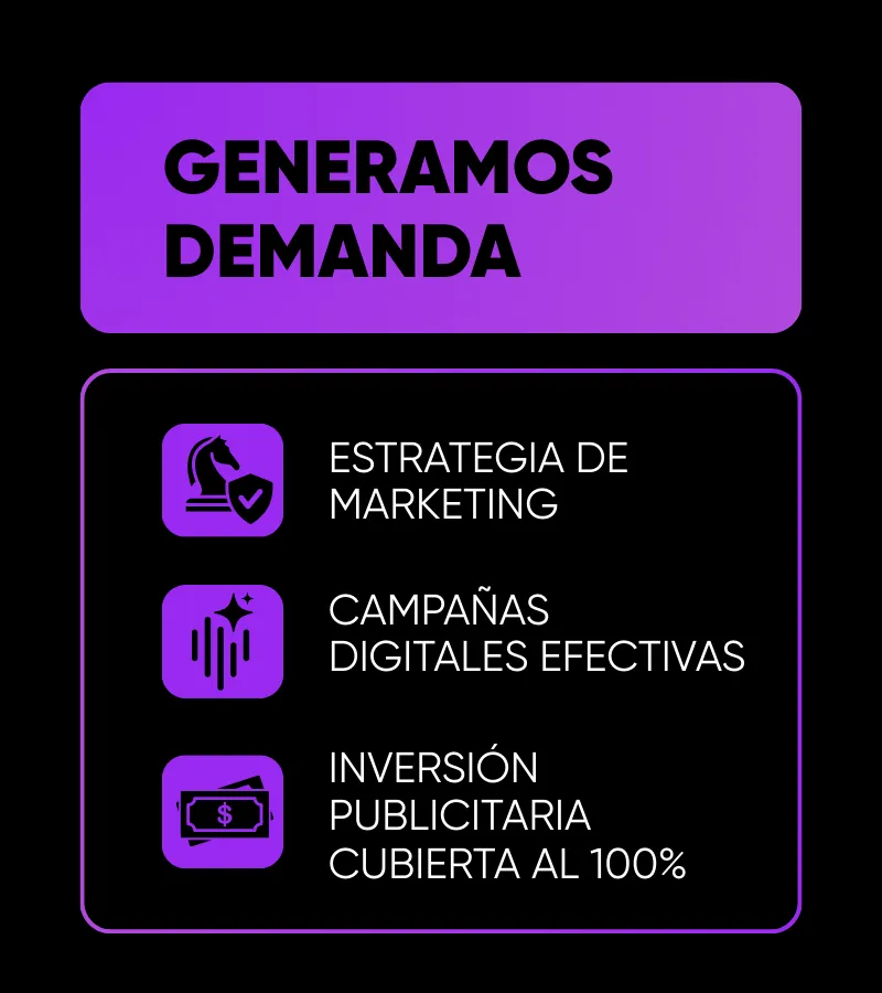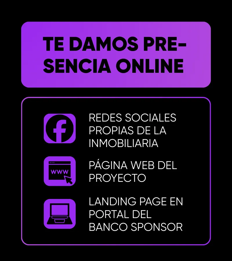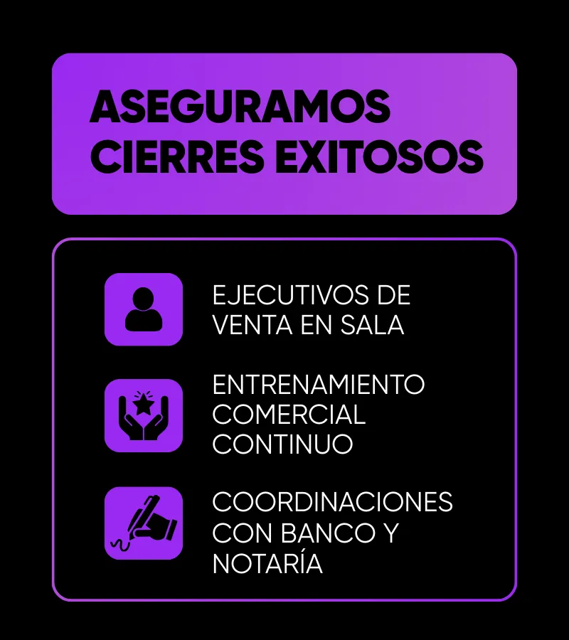 Impulsamos tu proyecto y tu marca inmobiliaria, invertimos y ejecutamos TODO sin pedirte S/1 hasta cerrar tus ventas con éxito. Conoce todo lo que abarca: